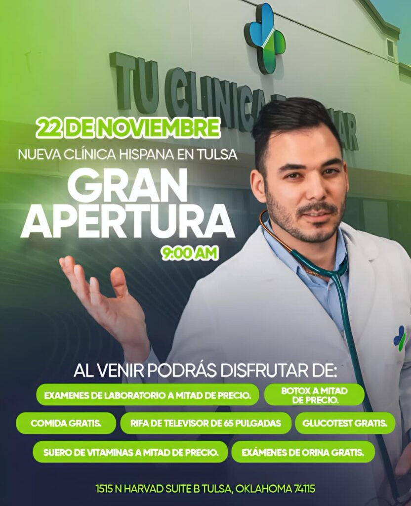 Tu Clínica Familiar continúa creciendo para estar más cerca de la comunidad. Este sábado 22 de noviembre, se llevará a cabo la inauguración de la tercera sucursal, ubicada en 1515 N Harvad Suite B Tulsa, Oklahoma 74115.